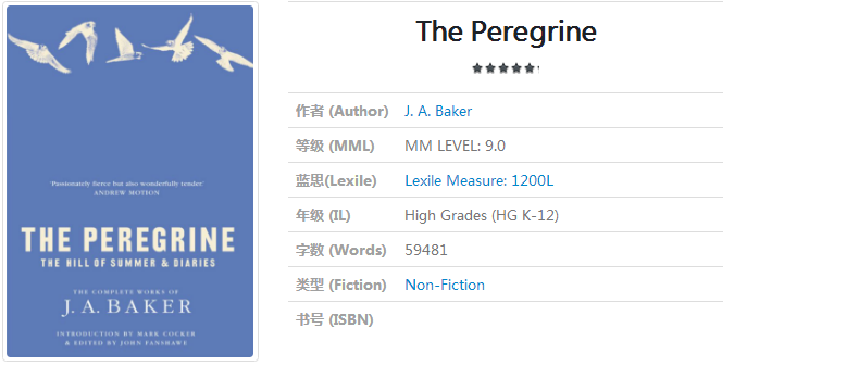 J.A.贝克是一位英国作家,他生前一共就出版过《游隼》《夏日山丘》两本书,然而这位几乎不为人所知的作家却不乏追随者,《游隼》就是在读者中游走的秘密,依靠口口相传成为一本少数人的经典。美国国家图书奖得主自然作家巴里·洛佩兹把《游隼》称为“我读过的关于野生动物的描写里写得最美的,观察最仔细的,也是最动人的作品之一”。著名导演沃纳·赫尔佐格也是贝克的拥趸,他宣称其散文是约瑟夫·康拉德水准的写作,并且把《游隼》列为无赖电影学院三本必读书之一,与之并列的是维吉尔和海明威的作品。