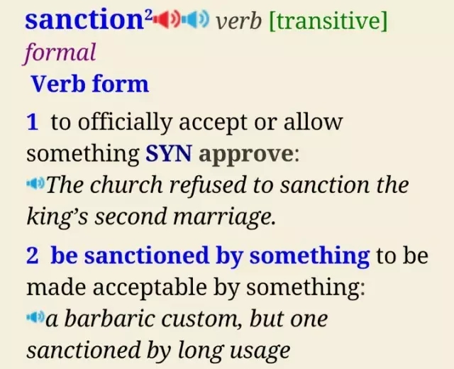 当sanction 表示“正式许可,批准,接受”时,前面的动词一般为 receive, require, get 等,后置介词则为with/without