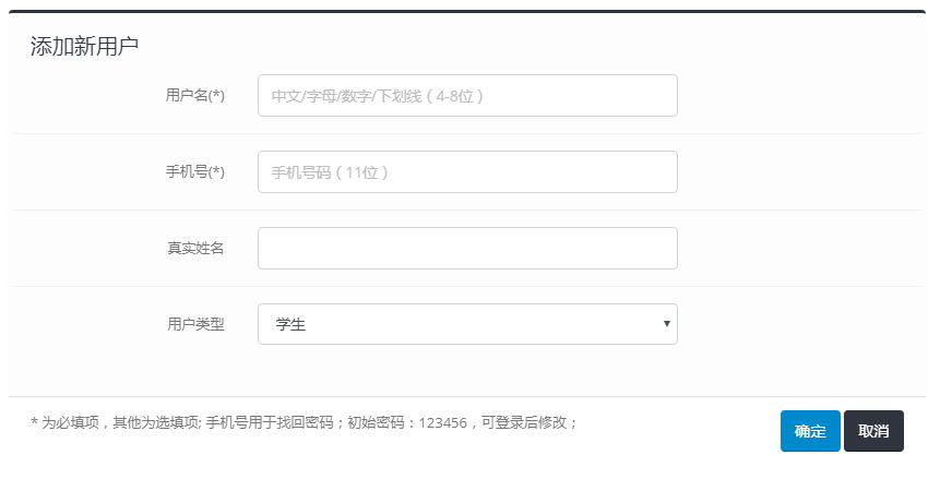 【用户名】和【手机号】是必填项。用户名建议使用中文名,这样方便分班和识别。请注意一个手机号只能绑定一个用户名。如果真实姓名可以添加备注名方便进一步识别。用户类型请根据用户类型选择。如果想要添加教师账号请选择“教师”。